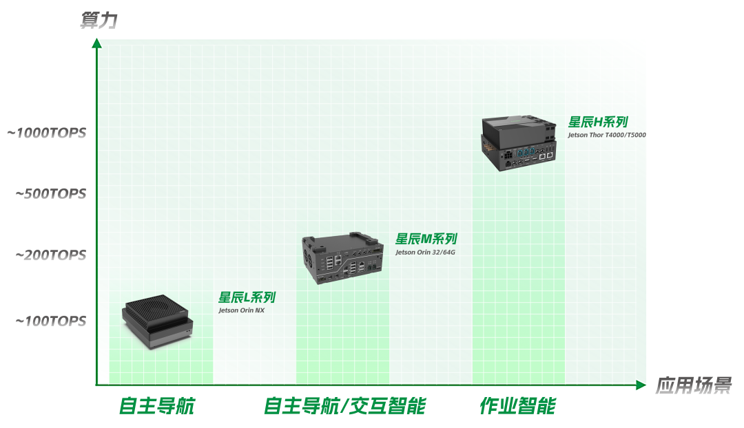 星辰系列是经过系统化设计的全新算力平台家族,核心优势在于实现100 TOPS至1000 TOPS算力区间的完整覆盖,精准匹配基础环境感知、多模态信息融合、复杂任务规划与实时控制等不同层级的算力需求。其中,星辰L系列搭载Jetson Orin NX 8/16G,适配自主导航场景;星辰M系列采用Jetson Orin 32/64G,支持自主导航与交互智能;星辰H系列基于Jetson Thor T4000/T5000打造,满足高阶作业智能需求。
