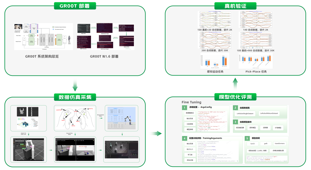 天准星辰H系列产品完成GR00T-N1.6基础大模型的应用部署、数据采集与模型优化。通过Isaac Sim搭建模拟仿真环境,构建数据采集系统,将采集的真实及仿真数据用于泛化数据集的生成;根据泛化数据集进行模型Fine Tuning,提高精细化动作的准确性和精度;经离线评估测试后开展真机实测,持续优化迭代动作成功率;最终形成从模型落地、数据供给、迭代优化到场景验证的完整链路,实现机器人在真实环境中的自主感知、决策与执行并能够持续学习不断适应新任务、提升性能。