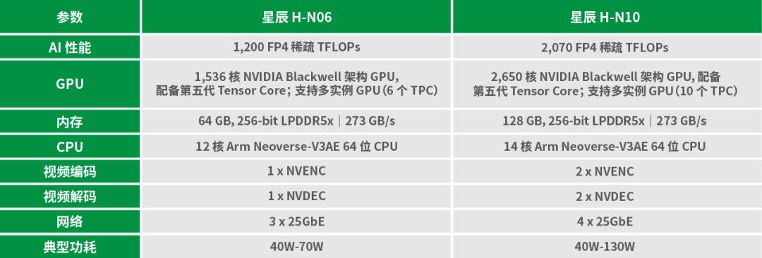 作为星辰系列的核心力作,星辰H系列延续星智007在高算力领域的技术积淀,可高效适配具身智能行业主流算法模型。其中,星辰H-N06与星辰H-N10(搭载T5000,前身为星智007)采用Pin2Pin引脚兼容设计,实现即插即用的无缝适配,大幅降低客户适配难度,缩短产品迭代周期。两款产品核心参数对比如下: